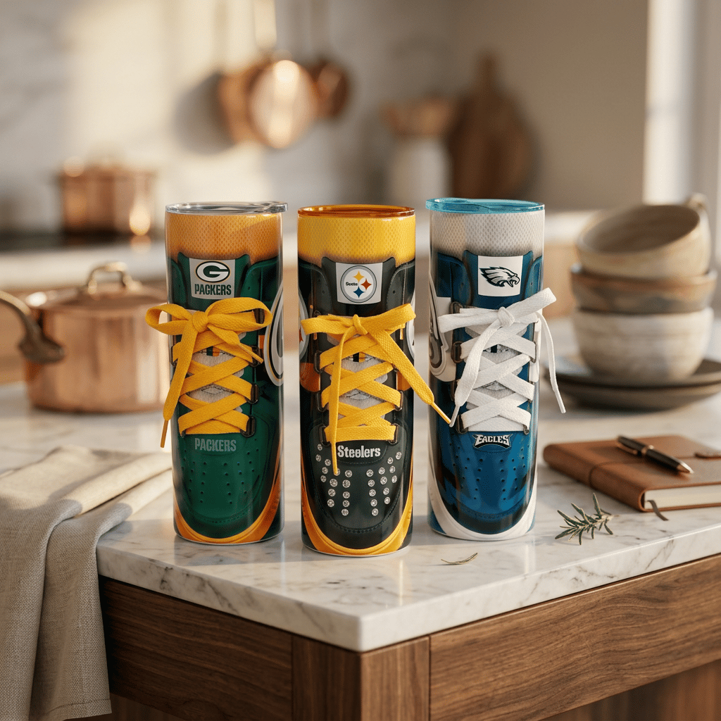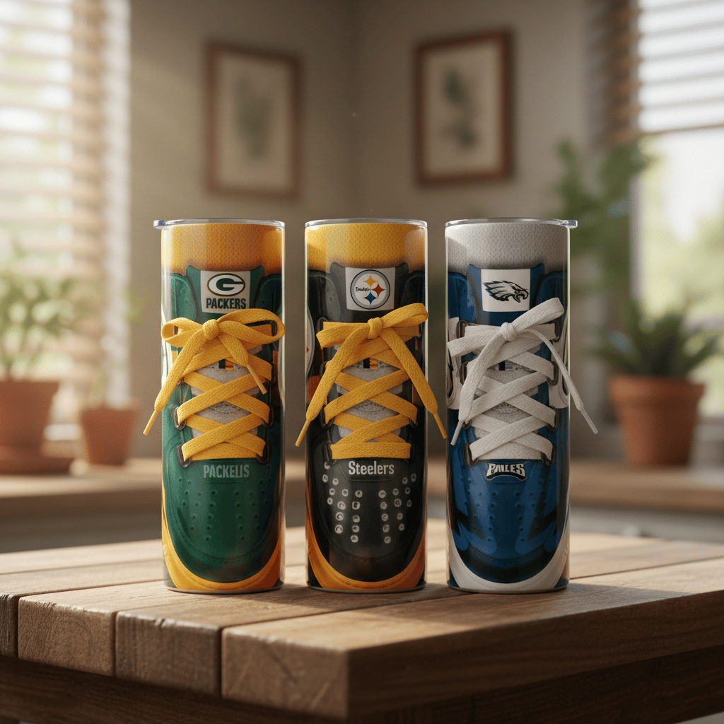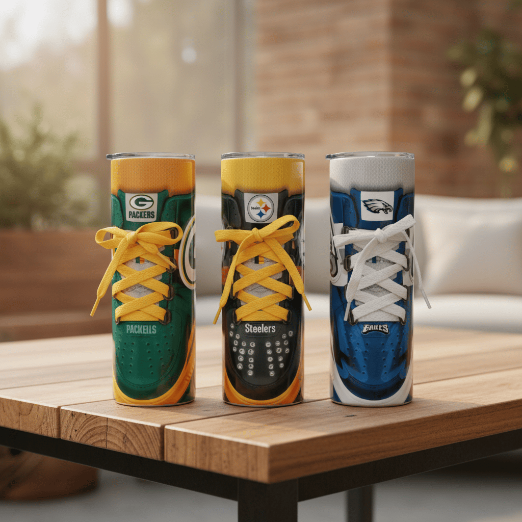 Don’t miss out on these bold and sporty 20oz skinny tumblers featuring sneaker-inspired designs in your favorite team colors! These are clearance items, making them the perfect grab for football fans who want style and savings.